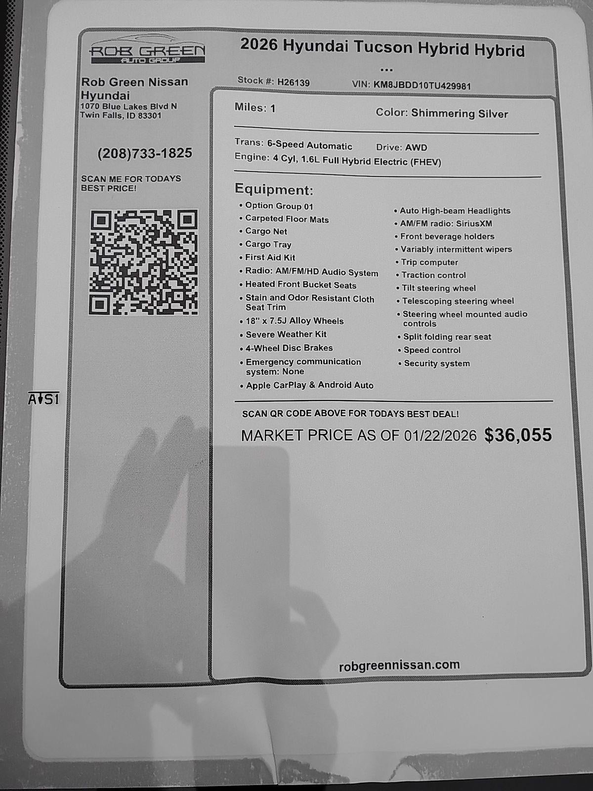 $4,322 off MSRP! 2026 Hyundai Tucson Hybrid SEL Shimmering Silver AWD 1.6L I4 DGI Hybrid Turbocharged DOHC 16V LEV3-SULEV30 6-Speed Automatic