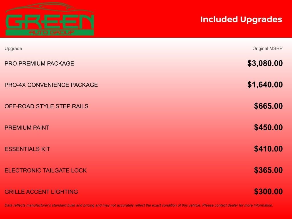 4WD, 17 Painted Alloy Wheels, 3.692 Axle Ratio, 4-Wheel Disc Brakes, 6 Speakers, ABS brakes, Air Conditioning, All Season Floor Mats w/PRO-4X Logo, Alloy wheels, AM/FM radio: SiriusXM, Anti-whiplash front head restraints, Auto High-beam Headlights, Auto-Dimming Mirror, Auto-Tilt & Slide Sunroof w/Manual Shade, Automatic temperature control, Black Accent Package, Blind Spot Warning, Brake assist, Bumpers: body-color, Delay-off headlights, Driver door bin, Driver vanity mirror, Dual front impact airbags, Dual front side impact airbags, Electronic Stability Control, Electronic Tailgate Lock, Emergency communication system, Essentials Kit, Fender Premium Audio System w/10 Speakers, Front anti-roll bar, Front Bucket Seats, Front Center Armrest, Front dual zone A/C, Front fog lights, Front reading lights, Front wheel independent suspension, Fully automatic headlights, Grille Accent Lighting, Heated Front Bucket Seats, Heated front seats, Heated Steering Wheel, Heated steering wheel, HomeLink UGDO, Illuminated entry, Intelligent Around View Monitor (I-AVM), Knee airbag, Leather Seat Trim, Leather steering wheel, Low tire pressure warning, Mud Flaps, Nissan Door-to-Door Navigation, Occupant sensing airbag, Off-Road Style Step Rails, Overhead airbag, Overhead console, Panic alarm, Partial Under-Seat Storage Delete, Passenger door bin, Passenger vanity mirror, Power door mirrors, Power driver seat, Power passenger seat, Power steering, Power windows, Premium Paint, PRO Embroidered Premium Cloth Seat Trim, PRO Premium Package, PRO-4X Carpeted Floor Mats, PRO-4X Convenience Package, Radio data system, Radio: SXM/AM/FM/AUX/USB Audio System, Rear anti-roll bar, Rear seat center armrest, Rear side impact airbag, Rear step bumper, Remote keyless entry, Security system, Speed control, Speed-sensing steering, Split folding rear seat, Steering wheel mounted audio controls, Tachometer, Telescoping steering wheel, Tilt steering wheel, Tow Package (T11), Traction control, Traffic Sign Recognition (TSR), Trip computer, Variably intermittent wipers, Voltmeter, Wireless Apple CarPlay/Wireless Android Auto, Wireless Charging for Personal Devices, 4WD.