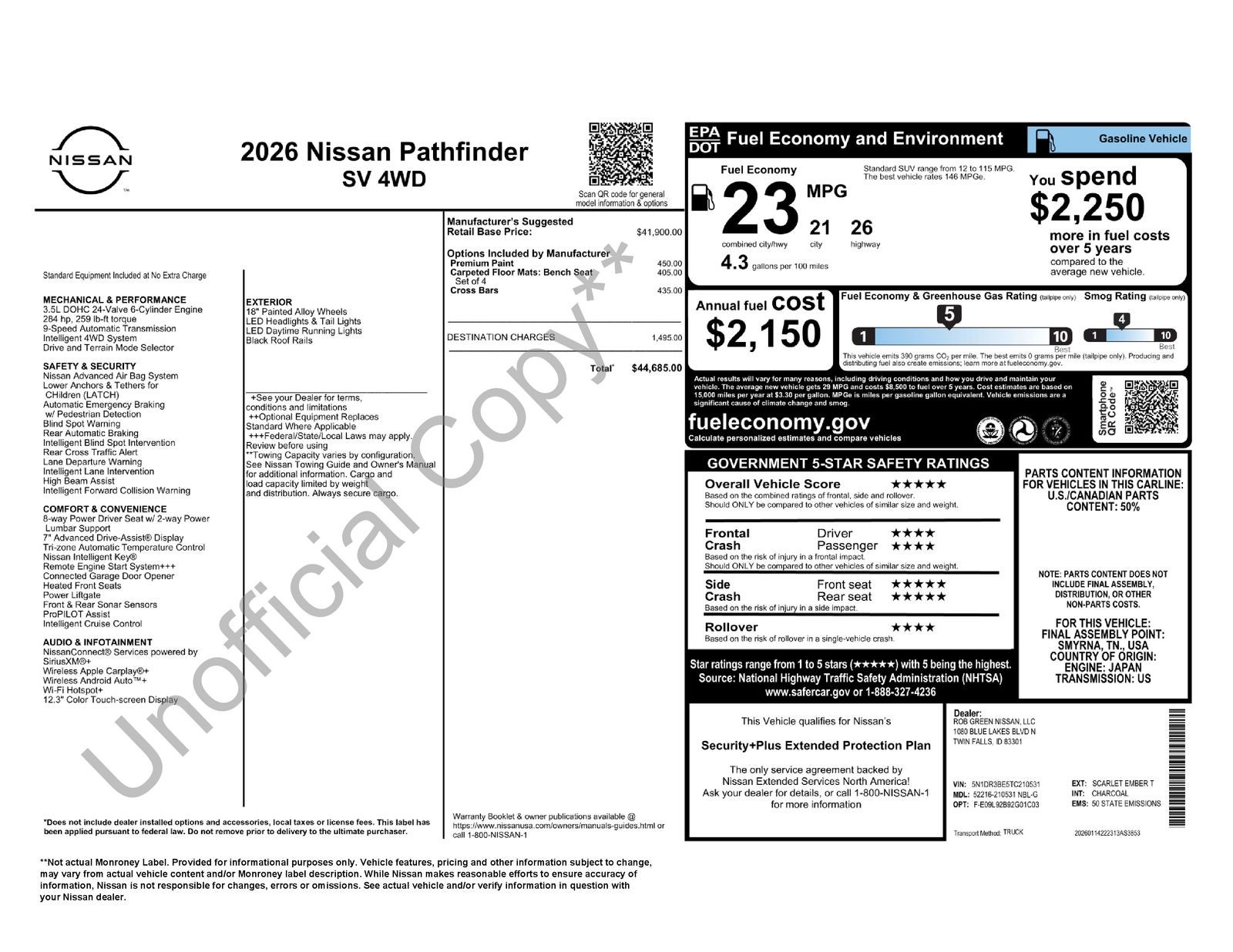 $6,564 off MSRP! 2026 Nissan Pathfinder SV Scarlet Ember Tintcoat 4WD 3.5L V6 DOHC 9-Speed Automatic